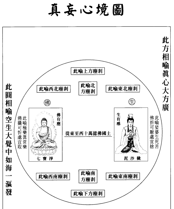 其内的一个圆相,譬喻十方无边之虚空也,而其圆形内的十个小方形之相,则是譬喻十方各如微尘数之世界也。而其内人形的身中有一个心字,乃是譬喻你如今胸中所蕴藏的六尘缘影之妄心也。此虚妄的缘影之心在我的身中,而我色身在此世界之中,世界则在虚空之中,虚空则在广大觉性本然的真心之中。