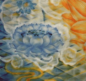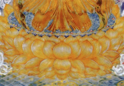 在观无量寿佛经里提到,佛告韦提希:‘欲观彼佛者,当起想念,于七宝地上,作莲华想。令其莲华,一一叶上,作百宝色,有八万四千脉,犹如天画。脉有八万四千光,分明,皆令得见。华叶小者,纵广二百五十由旬。如是莲华,具有八万四千叶,一一叶间,有百亿摩尼珠王,以为映饰。一一摩尼珠,放千光明,其光如盖,七宝合成,偏覆地上。’阿弥陀佛历劫愿行所成,即免费奉赠凡夫的莲华,是如此充满德性庄严,而鄙陋的我,连画几片小莲叶都如此的困难,甚至还要因困难而涌起了恶念,忏悔的眼泪,一滴一滚的滴到莲叶上,真的,莲座是眼泪调和著颜料画起来的。因过误累累,对这一切糟糕的笔画只有不断涂白忏悔重画,经验中只有专注念佛几乎没有意识要如何画的线条能保留下来,所以有好多处,昼纸原来的布纹面,都因涂厚而变平了,每一笔都是破坏,每一笔也都是建设。喷笔忽然爆喷所成的污点,常是难以除去的,只好用忏悔改成飘落供佛的花儿,或一颗发光的珠子。其实污点和花朵都同是颜料,就如嗔怒与念佛都同是心念,然而运用不同,结果就不同。同一瓶颜料,画花就是花,昼佛就是佛,昼鬼也可吓人!理论虽然知道,但是控制心念即不容易,想画佛也会出很多差错,这才了解普贤菩萨为什么说‘虚空界,乃至众生烦恼不可尽故,我此忏悔无有穷尽。’每天都须涂白重画,有时中午祥师帮末学抬好画板,便去参加大众的念佛、课诵,傍晚来看即见一大片原以为画好了的画面又都涂白了,不禁常常摇头微笑,也许末学断气时,画上还留著一片涂白,来不及改过,但请您原谅吧,因为已经知道先前的过错了,末学的心念是错误百出的,只有待往生西方亲见弥陀,受佛法化,再来继续完成。