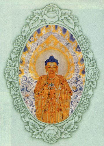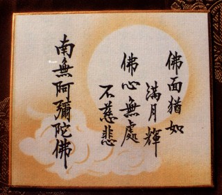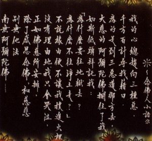 念佛,令人把心量拓展到无尽时空―无量光寿,从凡夫局促的心和有限而短浅的耐力中,跨越出来,迈向觉悟―觉悟自性原是无穷能源,无尽时空,无量光寿!奈何长劫以来,自己禁闭在狭碍的心胸中,用烦恼执著来惩罚自己,令自己不得自由,心花不得开放!庆幸的是得闻阿弥陀佛名号,唤醒我们面向光明广阔的时空,念念觉悟。在事事物物中拓宽世界,个己的痛苦就无足挂齿了,假如只凭凡夫局促的心情和自认有限的耐力,那真难以度过生命一切难关考验。当画佛面时,真感觉‘斯义弘深,非我能致’,只有勤礼佛,每每合掌念佛千声才敢恭绘三笔。佛慈无涯,佛智无量,实非末学微劣能画,只能祈请原谅一切幼稚冒昧。