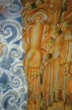 末学以前在印度鹿野苑的博物馆,看到佛的雕像,发现他每个手指的下节,好像都有薄膜连在一起,当时以为那是雕刻的时候,没有刻好的。后来看到经典的记载才知道,那是佛手的缦网,经云:‘巨指下节与食指根,及余三指下节,俱以薄皮相连,如鹅王掌,表里明莹,并展不歉’。那时候不晓得佛为什么要有这种缦网,如鹅王掌。一直到在画佛像的时候,有一天在洗笔,发现有一只小蚂蚁,掉到水里头,急急的要把它捞上来,捞了半天,可是它每次都从未学的指间缝隙里溜过去,等末学捞到它的时候,它已经死了,辛酸地看它死去,全想:‘假如自己的手上也生了像佛一样的缦网,那么就方便捞起它了’,那时才知道,原来佛手指间如鹅王掌,明莹的缦网,是为了在生死苦海里,捞起我们这沉沦的痛苦众生。
