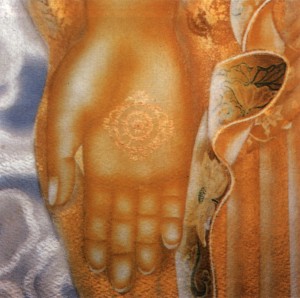 佛说造像量度经上说佛的‘掌中心有千辐轮相,而其外围绕,贝右旋螺贝,吉祥字、莲华、慈钩、慧剑等诸般德相,纹细密深且真刻,普偏散列为严饰。’但是末学没有见过,也不知道如何的表达。刘学长虔诚影印了日本国宝的照片资料,并且热心地向国立艺专的教授,请教了种种的问题,给末学很多的指导。还有从未谋面的学长,地无意中提供了布达拉宫里佛像的相片,及札什伦布市、世界第一大铜佛,手上千辐轮相的特写;长期借给我们马达,到现在都还素不相识的学长,也结缘了喷画的参考书本。