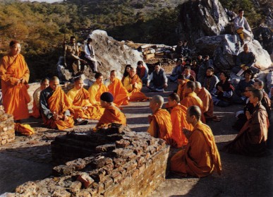 我听见了上头山顶大众已经开始诵经,爬上去,穿著黄袈裟的一群比丘似乎重现了昔日的庄严。望著供在座上、颈上挂满花环的佛陀,我静静坐在一个角落,听那带著泪的诵经声,响在山谷。每一个人发了自己的誓愿,每一个人得到了一股激励的力量。佛陀!我只是一个微渺的众生,却拥有您平等的慈悲。请给我片刻,让我坐在您的跟前,不要急急赶到别处好吗?我是一个小小的芥子,漂泊在虚空,而您是大胜须弥的无量倍,奇妙的是芥子竟能够容纳须弥,小小大大的一切差别,似乎在您的跟前便消融了,只是这样默默地坐在您的足旁,为什么如此满足?长老舍利弗,您智慧第一,请告诉我!‘原谅这逃学的孩子迟到吧!’佛陀,请不要笑我没有地藏菩萨的勇气,惊天地、泣请帮助我,虽然我听过您说:‘若以色见我,以音声求我,是人行邪道,不能见如来’也许就因此我总见不著您,但我只是一个彻底凡夫,虽然鼓著勇气却难免怯懦的时刻,所以请帮助我,让我能体会众生的痛苦如同身受;让我有能力解除痛苦给予亲切的了解与快乐。当五欲六尘蒙蔽我,佛陀!请让我察觉,请让我永远看见别人的对处和自己的错处,知道改进与学习......。