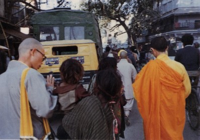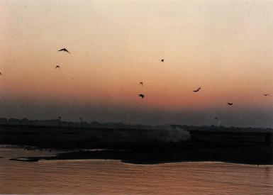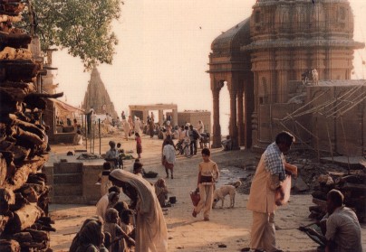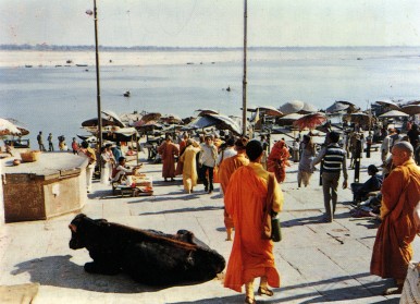 下午我们往恒河去,经过一个城,这个奇妙的城,比台北的西门町更拥挤,迎面而来,后拥而来,四面八方拥来,牛车啦、马车啦、羊啦、汽车啦、公子哥儿啦、乞丐啦、到圣河沐浴的印度教徒啦,从古代到现代的交通工具,从古装到新潮的打扮,都出现在这街道上,没有交通规则,可以自由靠左靠右乱走,在十字路交叉口,不知该往何处走,这是一种令人发笑的乱走,真的是乱走,表面上好像很混乱、很拥挤,可是实际上非常的悠哉,也没有任何危险和交通事故,可以说是‘悠然的拥挤’,可以说是古今的大会串,时代的隔阂消失了,消失得很美妙,地摊卖的仿佛是阿拉丁神灯时代的东西,卖的人也是长须白发的古人,买的是穿著丝袜高跟鞋的今人。店铺里的东西、一切的陈设是伊斯曼彩色综艺体阔银幕,有一种看电影的感觉,似乎有许多的声音同时发出,但是又一点也不吵,似乎一切本然存在,亘古以来,不曾增加什么,或是减少什么,我们一批人拥入这个人流之中,不觉得更挤,我们流出也不见得更松。就这样的拥入人流,迈向河流;拥出人流,来到河岸,又拥入河流,迈向另一群人流,是出?是入?是入?是出?‘盈虚者如彼,而卒莫消长也’。