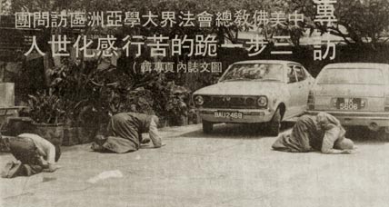 恒实比丘、恒朝沙弥实行他们的宏愿“三步一跪拜”, 在首都鹤鸣寺门前,苦行不倦,引起马大医学系的杨招福也跟着三步一跪拜。