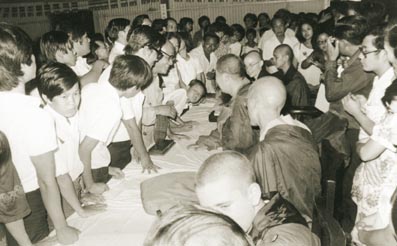 法会完毕,一群信众紧围上人,不愿上人离开。