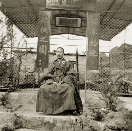 1955年,上人摄于西乐园寺。后方对联:西来福地,乐彼之园。