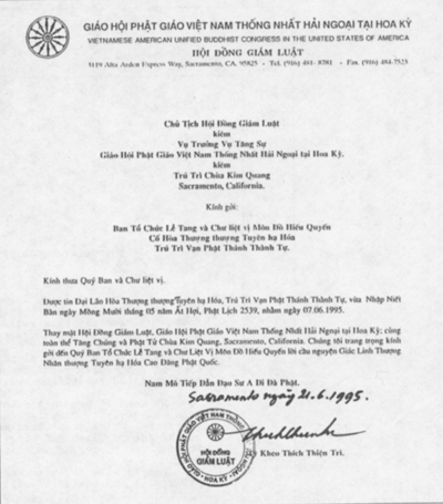 在此谨代表驻美“越美佛教律学指导委员会”,及加州沙加美度“金光寺”四众弟子,与诸仁者同为已往生佛国的宣公上人祈祷。
