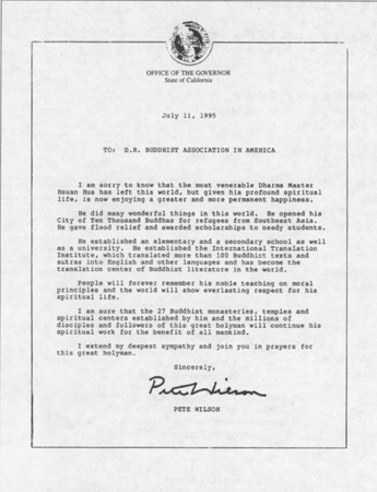 加州州长办公室致佛教总会: