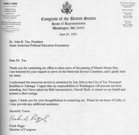 我知道追思大会将会在七月二十六日于万佛圣城举行。很遗憾的,因为我在华盛顿,有职责在身,使我无法参加此会。不过我会请 Darrell Shull 代表我去参加,并呈上一份简短的颂词。