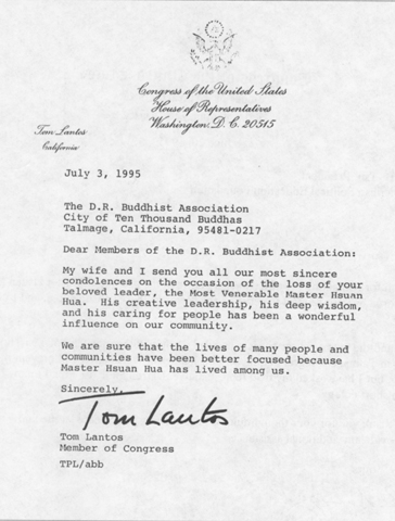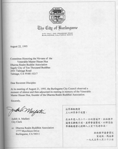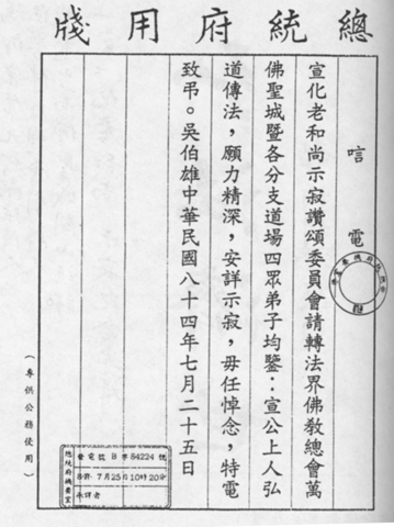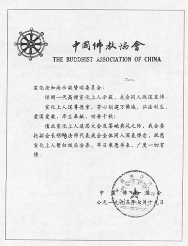 得悉宣公上人于一九九五年六月七日入涅盘,吾人深感痛惜。上人将佛陀的教诲带给西方,在弘扬佛法上的供献可以说功德无量。他在世上的消失对各国佛教界人士都是一个损失。