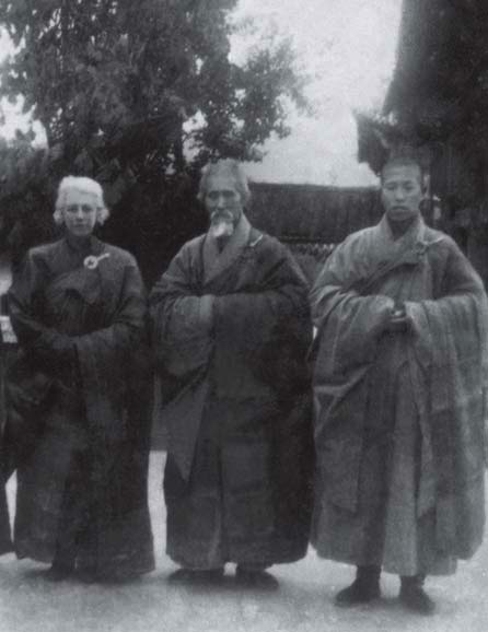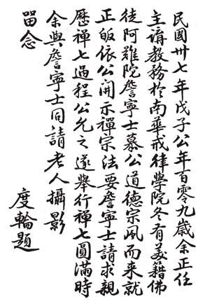 上人除任戒律学院监学法师之外,后来传戒,又担任尊证阿阇梨。本来三师七证,必须由高僧大德担任;上人那时受具足戒没多久,足见虚云老和尚委以重任之心切。同年冬天,有一位生长在美国天主教家庭,却一心研究佛学的阿难陀詹宁士女居士,因仰慕虚云老和尚禅德,透过中美两国外交当局斡旋,远渡重洋到南华寺参礼虚老。那时,上人担任南华寺教务主任之职;该女居士邀虚老及上人一起拍照,以资留念。