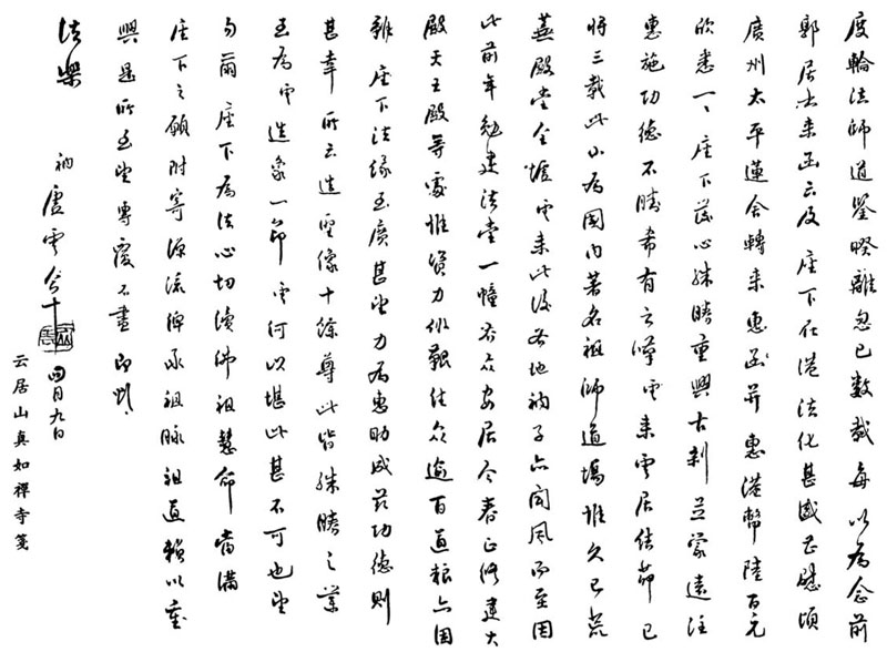 睽离忽已数载,每以为念。前郭居士来函云及座下在港法化甚盛,至慰!顷广东太平莲舍转来惠函,并惠港币陆百元,欣悉一一。座下发心殊盛,重兴古刹,并蒙远注,惠施功德,不胜希有之叹。云来云居结茆,已将三载。此亦为国内著名祖师道场,惟久已荒芜,殿堂全墟。云来此后,各地衲子亦闻风而至;因此前年勉建法堂一幢,容众安居。今春正修建大殿天王殿等处。惟资力维艰,住众逾百,道粮亦困难。座下法缘至广,甚望力为惠助,成兹功德,则甚幸!所云造圣像十余尊,此皆殊胜之业;至为云造象一节,云何以堪,此甚不可也!望勿尔!座下为法心切,续佛祖慧命,当满座下之愿。附寄源流,俾承祖脉,祖道赖以重兴,是所至望!专覆不尽,即颂