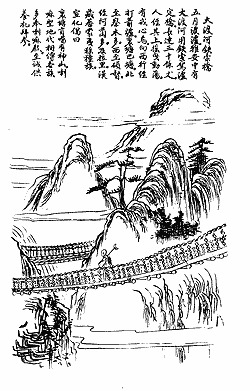 Crossing over the iron-chain bridge spanning the Ta Tu He River