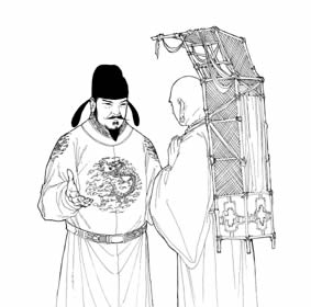 唐太宗不胜其烦,没有办法,就挑选大臣来护驾;挑了这个大臣,小白龙也照常来;挑了那个大臣,它也照常来。以后轮到秦琼(注 4)和尉迟公敬德(注 5)两人来护驾,他俩一来,就把小白龙吓跑了,因为他们是它的克星;从此每一天晚间都是由他们两人来为皇帝保驾。时间一久,皇帝觉得这两个人太辛苦了,也很对不起他们的,于是就把他们两个人的像,画到门上。小白龙晚上来到门口,一见这两个天神样的大将军,就不敢进来了。因为这样,所以门上就贴门神,老百姓家里也都贴尉迟公和秦叔宝(秦琼)的像,请他们两个做门神,演变成了中国的一种民俗。这当然是一种民间的传说,可是其中也有这个关系、这种情形。