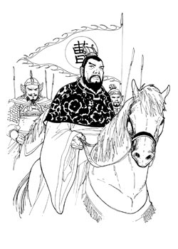 杀生待客吕伯奢:这吕伯奢本来想杀鸡、杀鸭、杀猪、杀羊,就不管杀什么,总而言之,是想杀鸡煨熟而食,杀鸡来款待曹操。可是这磨刀的时候,曹操一听磨刀的声音,就以为这个磨刀是预备杀他的。于是乎他就说我先下手为强,把吕伯奢全家什么人都给杀了,杀得光光的,然后就跑了!跑了,在半路上就遇到吕伯奢回来,吕伯奢说:“咦,你怎么这么快走了呢?我去给你打酒,回来我预备杀鸡、杀鸭、杀猪、杀羊的来请你吃哩。你怎么走了呢?”这么样一说,曹操就想:“喔,这是误会了人家要杀我;原来人家是要杀鸡、杀鸭、杀牛、杀羊、杀马来给我吃的,这怎么的对不起人… …”但是也没有办法了,已经杀了,好了,那“一不做二不休,杀人不死反为仇”,曹操就说:“我跟着你回去,吃肉去了。”吕伯奢在前头走,曹操在他后边,一刀又把吕伯奢给杀了(注7)。你看,就这么毒辣!是不是比蛇、比鬼都毒呢?