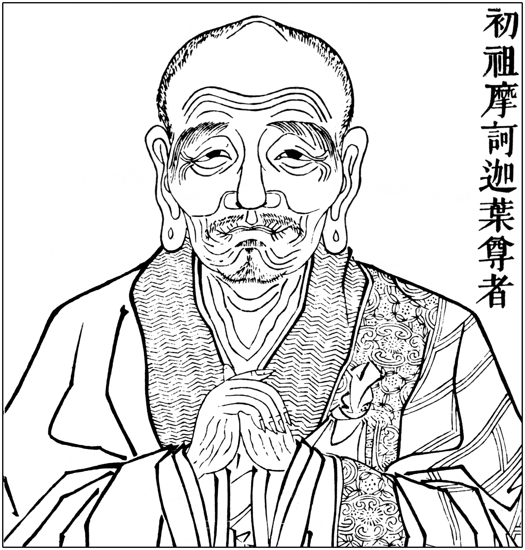 尊者。本摩竭陀国人。出婆罗门氏。其形金色。见佛出家。冀度诸有。佛于众中。称为第一。一日。佛于灵山会上。拈出一枝金色钵罗花示众。时大众默然。惟尊者破颜微笑。佛曰。吾有正法眼藏。涅槃妙心。实相无相。微妙法门。不立文字。教外别传。付嘱摩诃迦叶。复以金缕僧伽梨。嘱曰。转授当来慈氏佛。尊者作礼曰。恭依佛敕。后尊者以法转付阿难。即持僧伽梨入鸡足山入定。以俟慈氏下生。