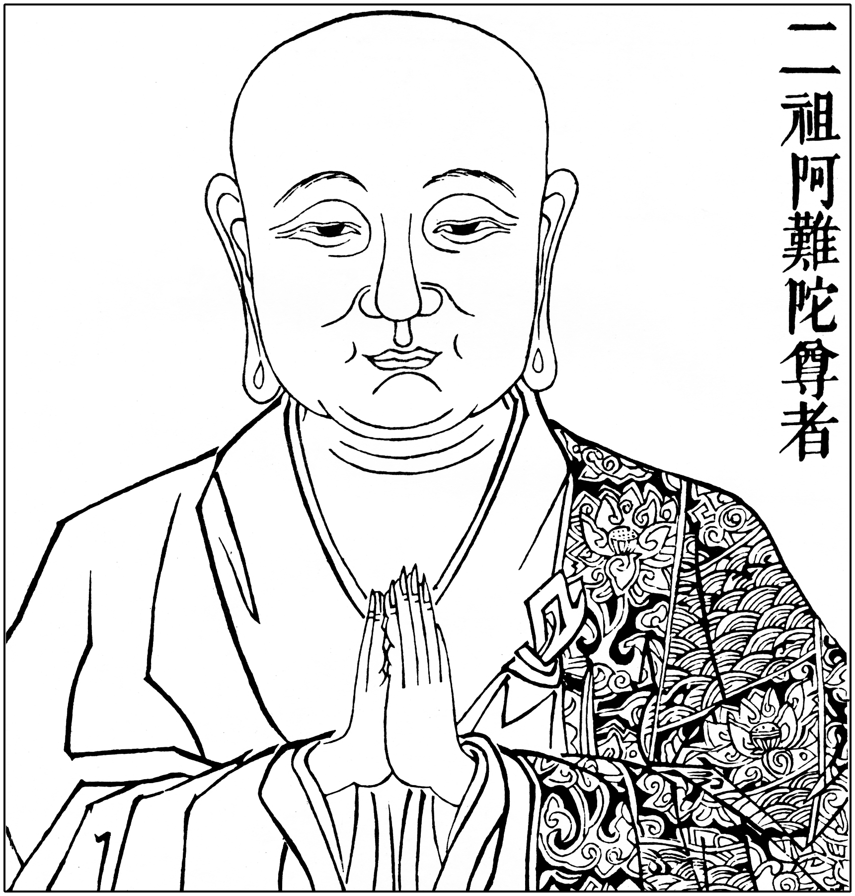 尊者。王舍城人。斛饭王子。佛之从弟也。多闻第一。一日问迦叶曰。师兄。世尊传金栏袈裟外。别传个什么。迦叶召阿难。尊者应诺。迦叶曰。倒却门前刹竿着。后迦叶乃告尊者曰。我今年不久留。今将正法付嘱于汝。汝善守护。后尊者转付法于商那和修。于恒河中流入灭。涌身虚空。现十八变。入风奋迅三昧。分身四分。一奉忉利天。一奉娑竭罗龙宫。一奉毗舍离王。一奉阿阇世王。各各造宝塔供养。