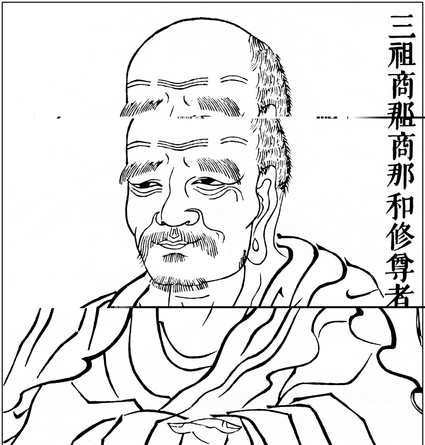 尊者。摩突罗国人也。姓毗舍多。在胎六年。应瑞而生。后出家学仙道。居雪山。因阿难将入灭。时山河大地六种震动。尊者同五百仙人礼阿难足。而跪请曰。我于长老。当证佛法。愿垂度脱。阿难即变恒河为金地。为说大法曰。昔如来以正法眼付大迦叶。转付于我。我今付汝。尊者既得法。降二火龙。以建梵宫。转大法轮。后付法与优波鞠多。即隐罽宾国象白山。现十八变火光三昧。用焚其身。
