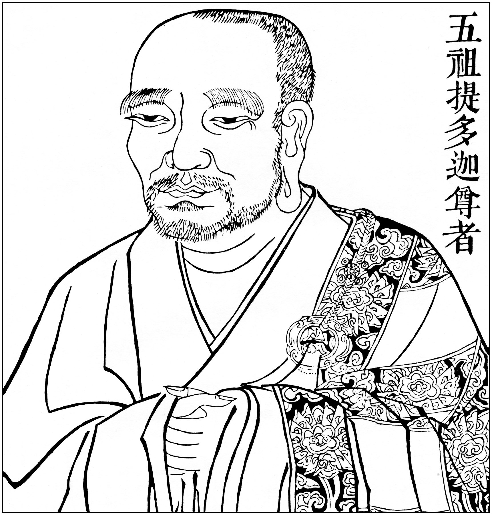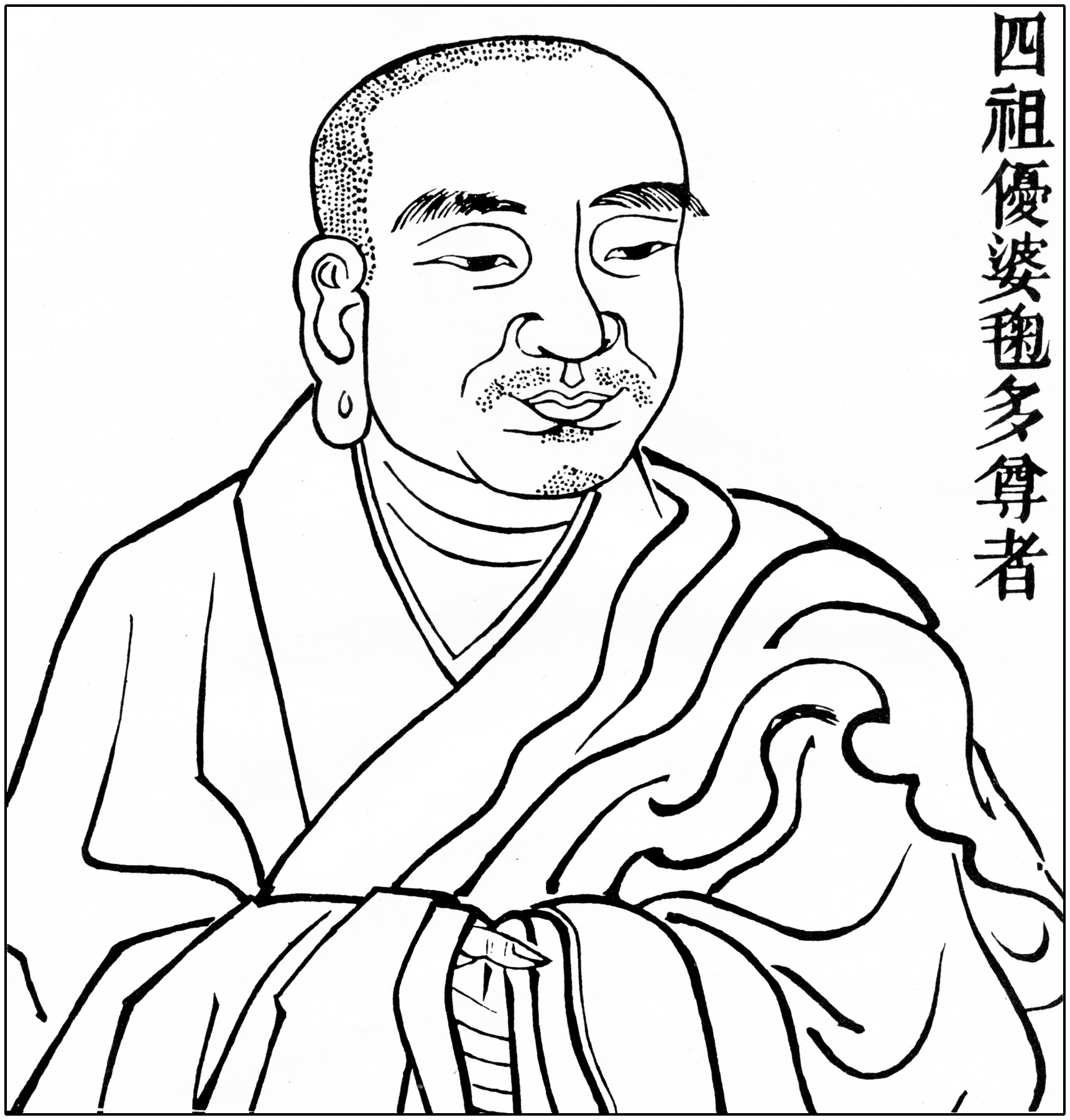 尊者。南印土天德王之次子。投婆舍祖出家。祖问曰。汝欲出家。当为何事。曰。我若出家。不为俗事。祖曰。当为何事。曰。当为佛事。祖付以大法。游化至东印土。彼王名坚固。奉外道师长爪梵志。即以幻法。化大山于尊者顶上。尊者指之。忽在彼众顶上。彼众怖惧。投祖。祖再指之。化山随灭。乃为王演法。俾趣真乘。后得般若多罗。即辞王曰。吾化缘已终。当归寂灭。即还本座。跏趺而逝。