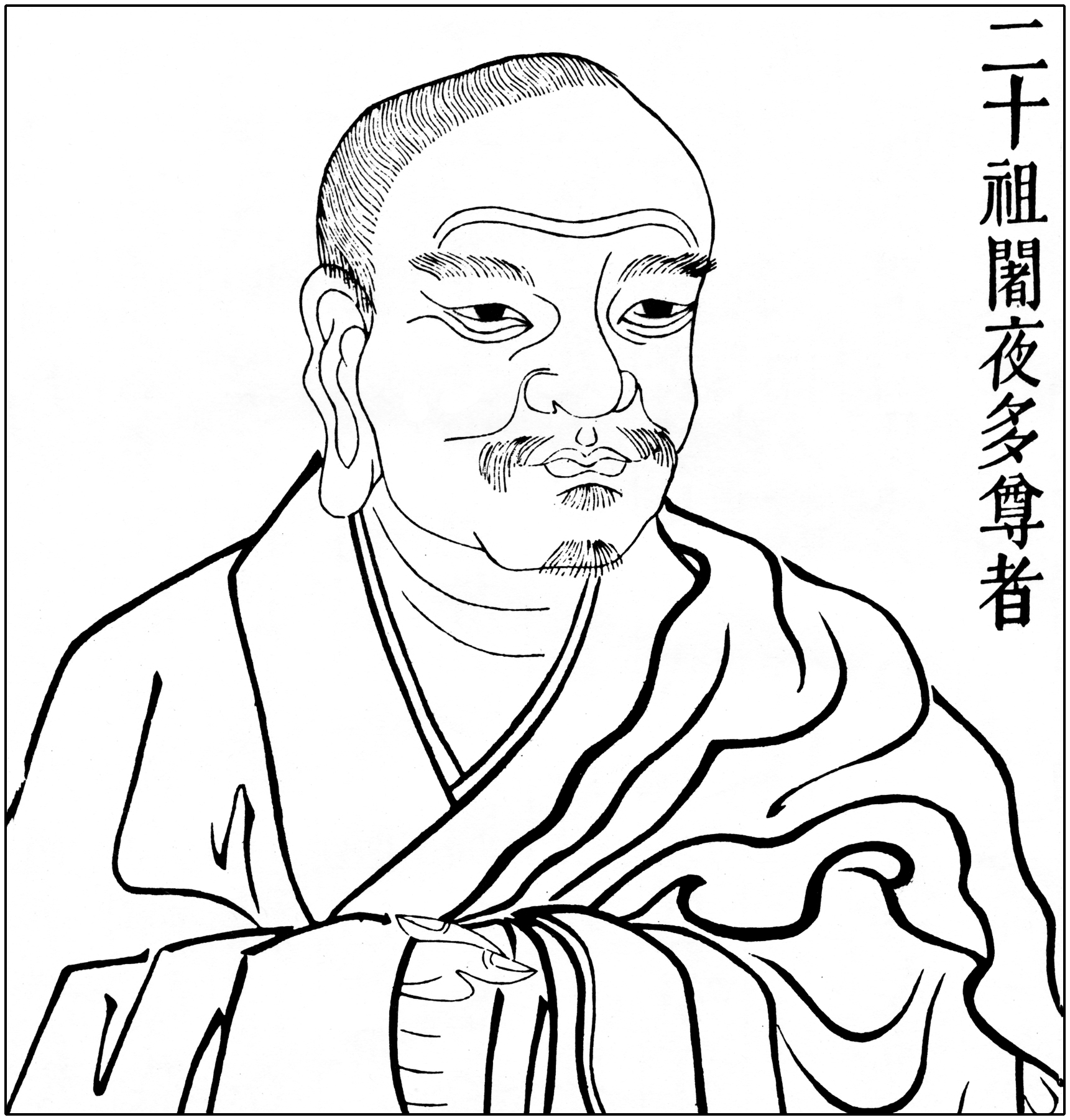 尊者。大月氏国人。因十八祖至。尊者问曰。是何徒众。祖曰。是佛弟子。彼闻佛号。心神竦然。即时闭户。祖良久扣其门。尊者曰。此舍无人。祖曰。答无者谁。尊者闻语。知是异人。遂开关延接。祖曰。昔世尊记曰。灭后一千年。有大士出现于月氏国。绍隆玄化。今汝值我。应斯嘉运。于是出家授具。付以大法。尊者得法已。后得阇夜多。即于座上。以指爪剺面。如红莲开。放大光明。照曜四众。而入寂灭。