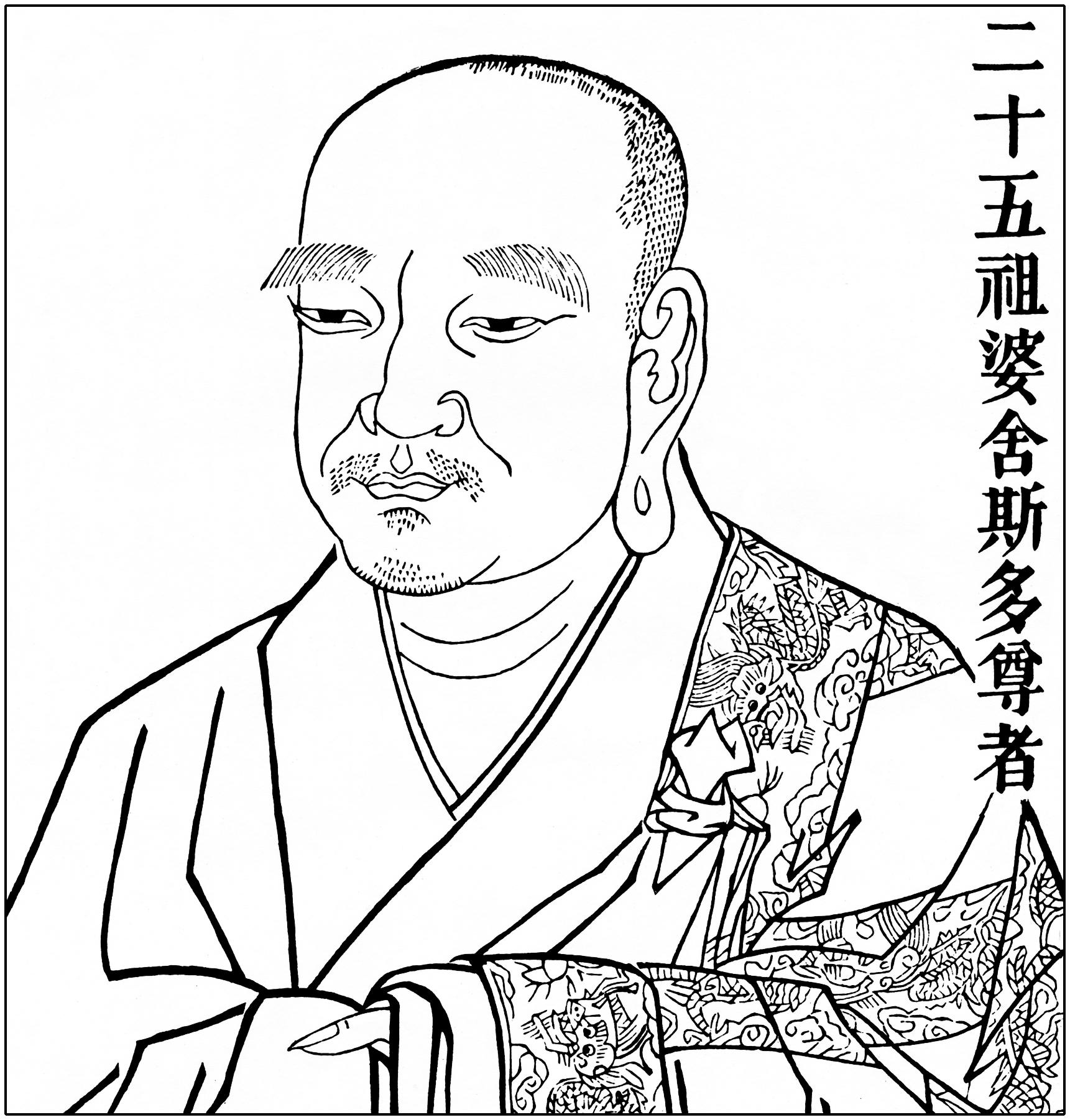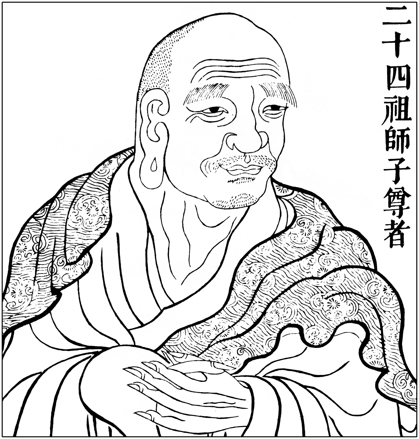 尊者。罽宾国人。初。母梦得神剑。因而有孕。既诞。拳其左手。父引见师子祖。问其故。祖即以手接曰。可还我珠。尊者遽开手奉珠。遂舍出家。祖为薙度曰。吾师密有悬记。罹难。正法眼藏。转付与汝。得法后。潜隐山谷。国王天德。迎请供养。后王太子德胜即位。信外道法。致难尊者。出衣示之。王命焚衣。五色相鲜。薪尽如故。王即追悔。致礼。后付法衣于密多。即现神变。化火自焚。平地舍利。可高一尺。